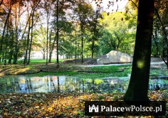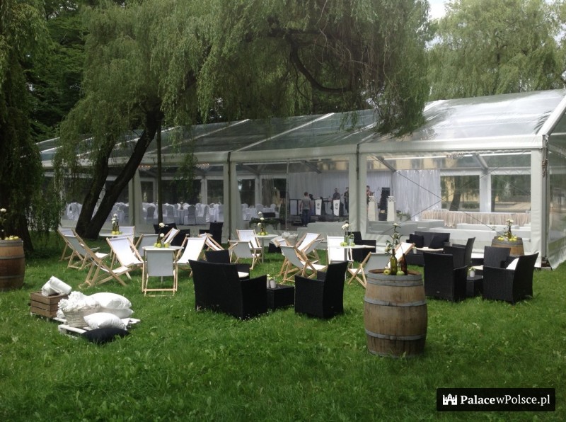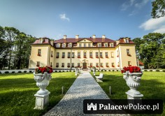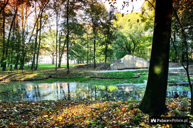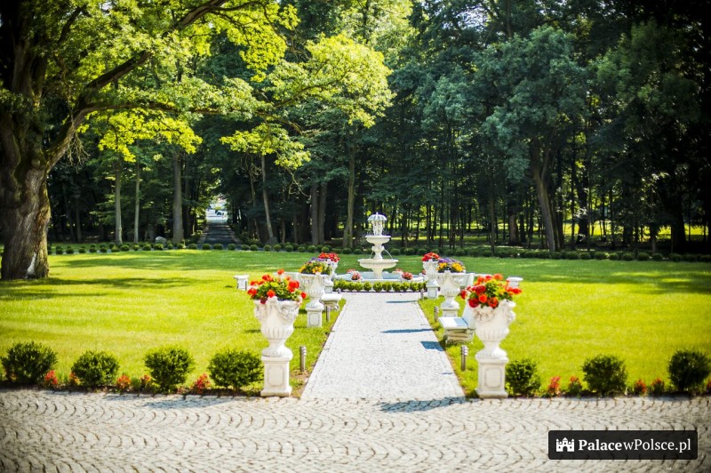 Na słupach przy bramie wjazdowej umieszczono dwa kamienne dziki, będące częścią herbu zasłużonego dla gminy rodu Strachwitz. Po drugiej stronie bramy rozpościera się ogromny, 11hektarowy ogród. Na tej powierzchni rosną drzewa o szlachetnym rodowodzie i rzadko spotykane krzewy. Wśród nich rośnie niejeden długowieczny pomnik przyrody.